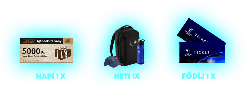 2. heti nyeremények – 4 db (négy darab) egyenként 15.000,- Ft (azaz tizenötezer Forint) értékű ajándékcsomag, amely tartalmaz 1 db logózott baseball sapkát, 1 db 750 mililiteres kulacsot és 1 db 28 literes hátitáskát, melyek mindegyike UEFA és Pepsi logóval ellátott.